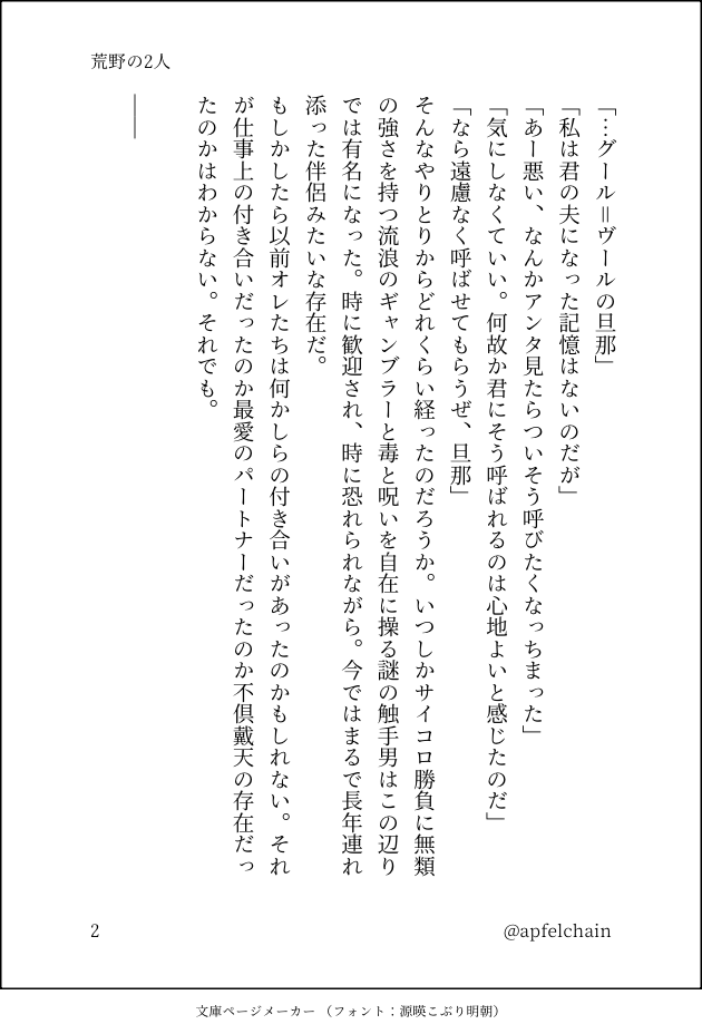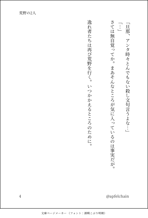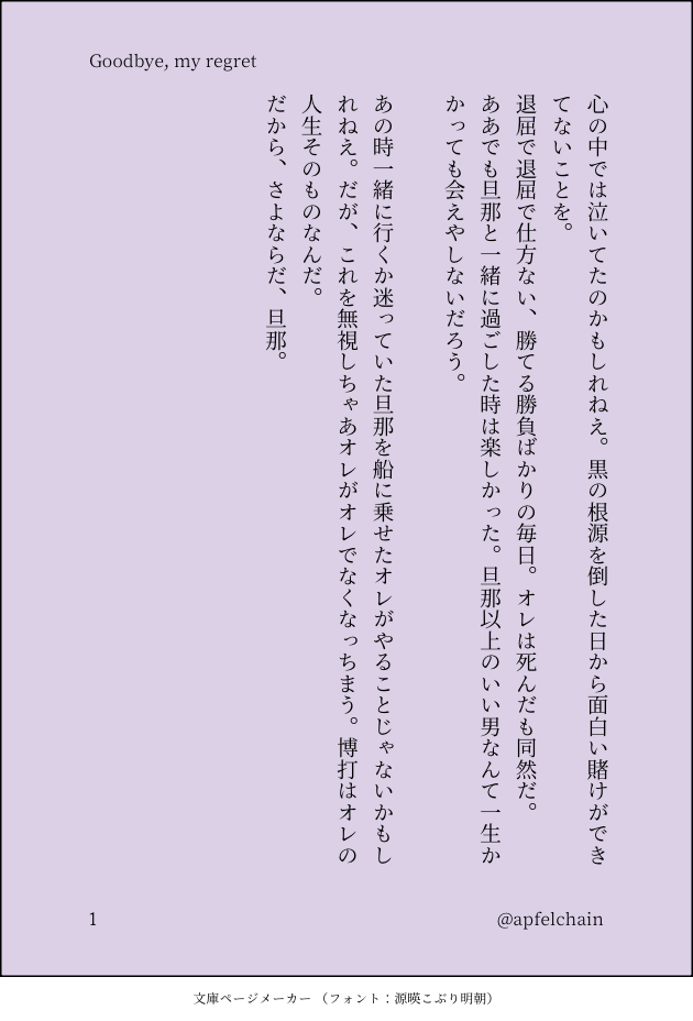 初めて彼が私のことを「旦那」と呼んだ日のこと。銃の使い方を教わった日のこと。愚かさも醜さもひっくるめて自分のことが好きだと言ってくれた日のこと。何気ない一日とて忘れたことはない。