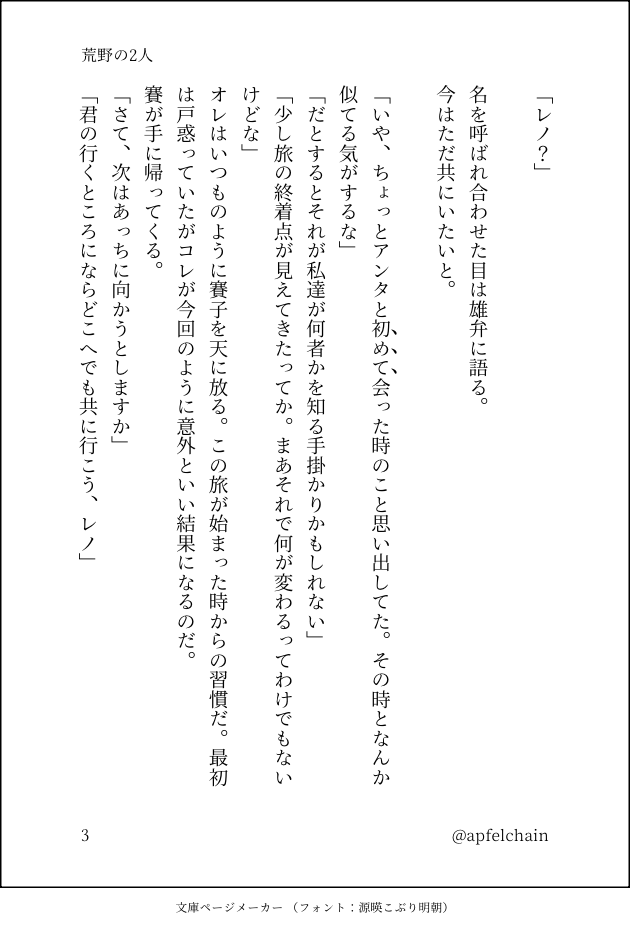 またこの笑みだ。それなりの時間を共に過ごして気が付いたが、レノは時々戦闘やギャンブルに臨むときや仲間たちと接するときとは少し違う表情を見せることがある。初めて私のことを「旦那」と呼んだあの日に見せた笑み、銃を教わった時に微かに触れた指の温度、船室で共に飲む時の穏やかな目。この声が、ぬくもりが、表情が、私を虜にするのだ。できるなら、私以外にこの表情を見せて欲しくないなどと邪な思いを抱いてしまうほどには。